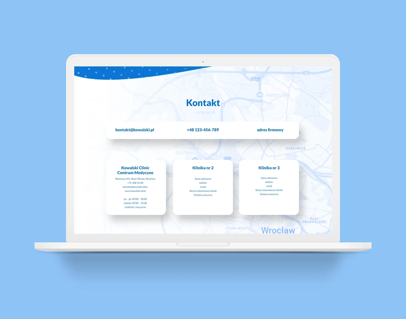 Dominują odcienie niebieskiego, które są kojarzone z opieką medyczną, spokojem i zaufaniem.